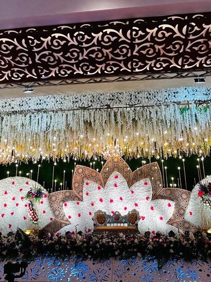 I design stages for receptions and sangeet events of all sizes, from grand floral walls with chandeliers to elegant outdoor setups. My service includes custom lighting, couple monograms, and special effects like fog or cold pyro to create a memorable backdrop for your celebration in Bangalore, Hassan, or Mysore.