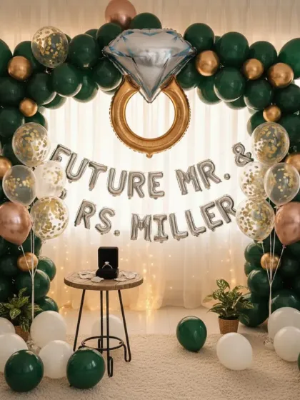 - Engagement: I set up elegant engagement balloon backdrops and custom foil balloons (rings, initials), plus cake tables that look great in photos.