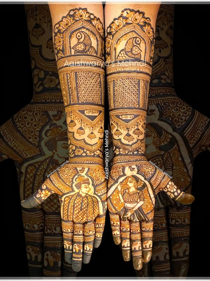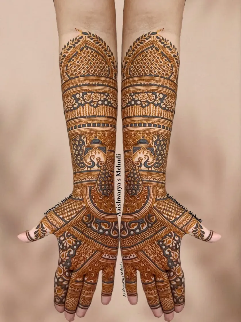 For the bride who wants the full traditional experience. These designs are dense, detailed, and extend up the arms, featuring classic patterns and motifs for a stunning bridal look.