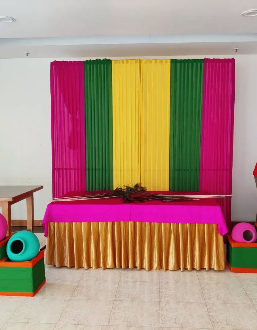 I create dedicated pooja areas and darbaars for various religious ceremonies. This includes thematic backdrops and props for Janamashtmi, pandals for Ganesh Chaturthi, and stages for Mata ki Chowki.