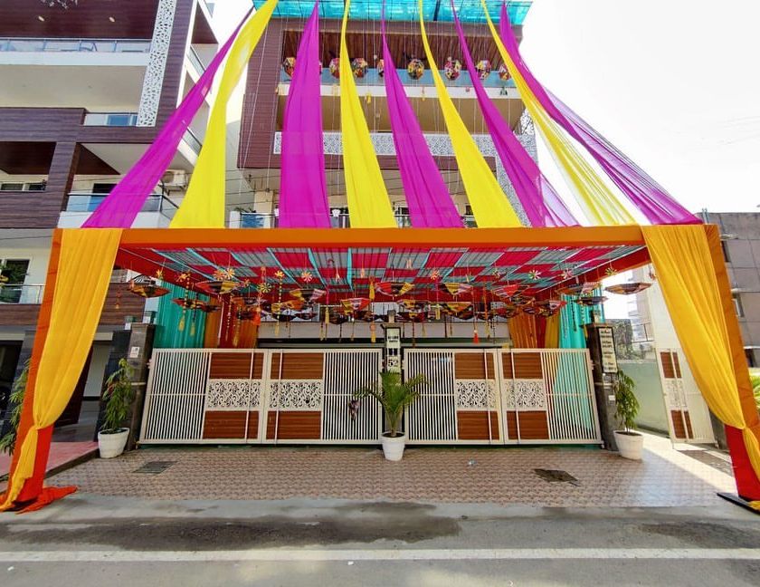 We create a vibrant and festive atmosphere for ceremonies like Mehandi, Sangeet, or any traditional function. This includes colorful fabric draping for house entrances and creating beautiful backdrops and seating areas.