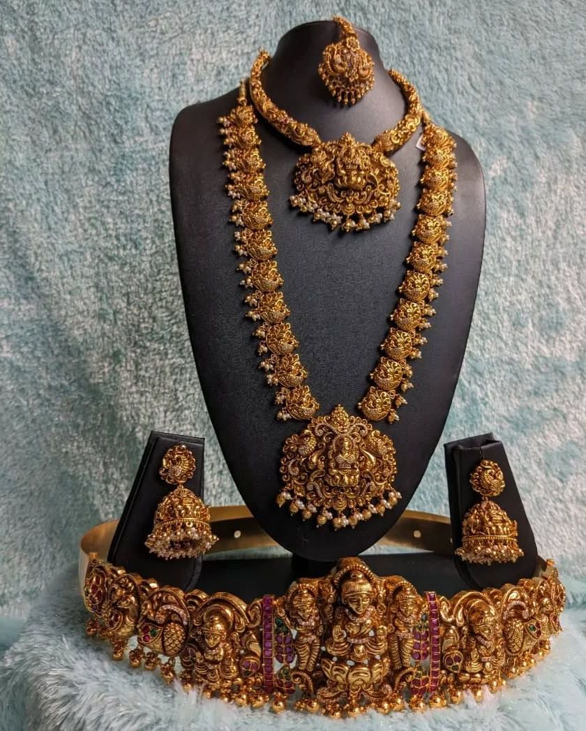 Embrace timeless elegance with my collection of antique temple jewellery, perfect for your muhurtham or any traditional ceremony. I offer a variety of rental options, including classic Kaasina Sara (coin necklaces), pieces with Laxmi and peacock motifs, and full bridal sets with an authentic antique gold finish.