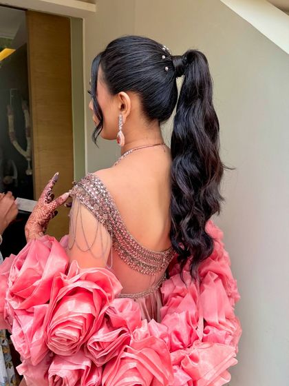 - Sangeet and cocktail nights call for waves, half-up curls, or a glam high ponytail with pearls.