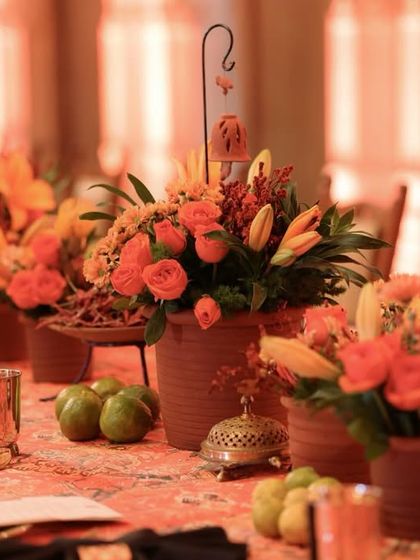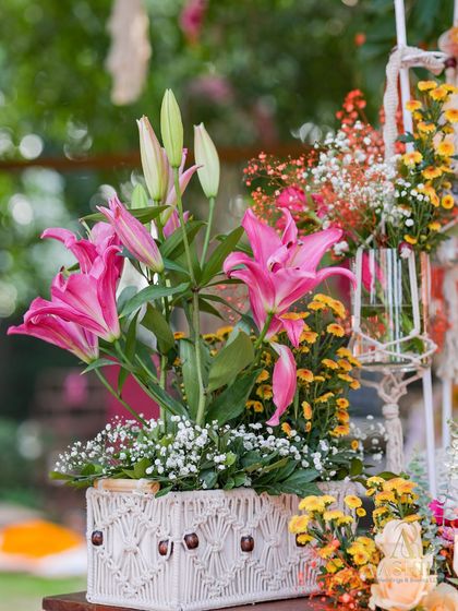 Our floral arrangements often feature statement pieces like vintage gramophones and handcrafted vases, creating Instagram-worthy setups that enhance the overall event ambiance.