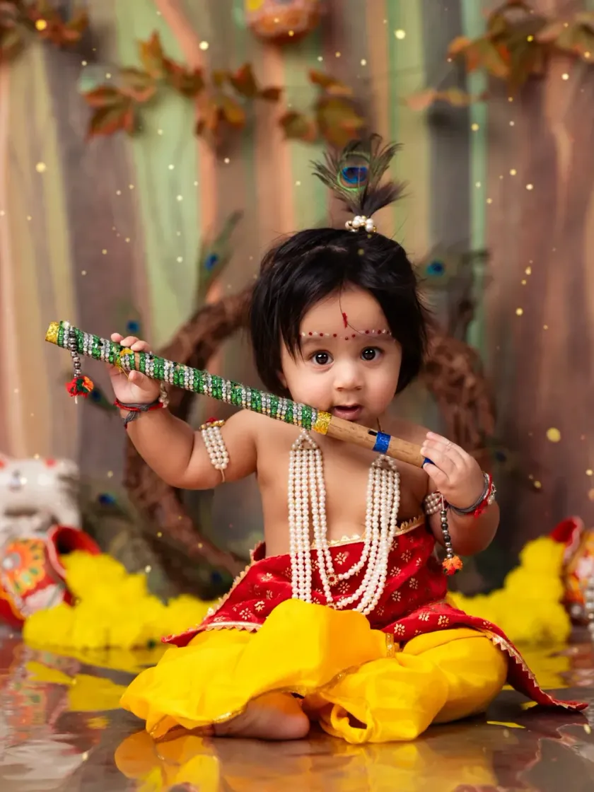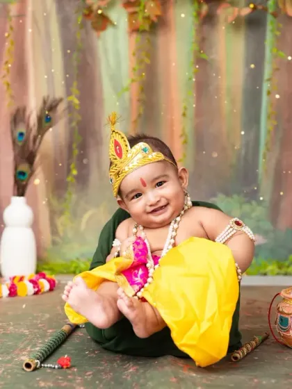 This is one of my favorite themes, perfect for celebrating your little one with a touch of cultural tradition. I provide all the props, including the peacock feather, flute, and traditional attire, to create these divine portraits.