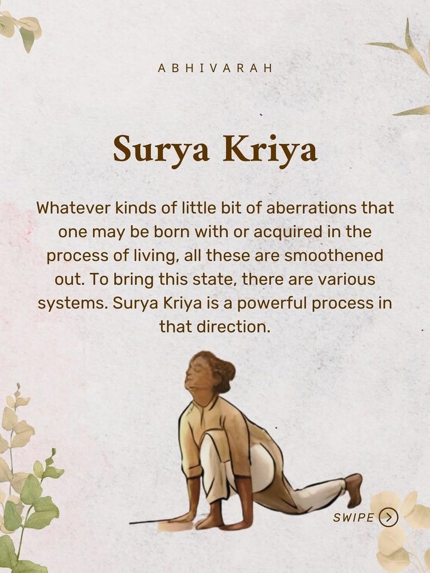 Surya Kriya is the original sun salutation, a potent spiritual process to align you with the cycles of the sun. This practice activates the solar energy within, bringing stability, mental clarity, and the possibility to live with ease and without friction.
