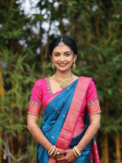 Hi, I’m a bridal makeup and hair artist, 8 years in this world with my brushes. Certified by some amazing mentors, but honestly, every bride teaches me something new. Makeup for me is like second skin—no cakey layers, just your beauty, but glowing. I adore Maharashtrian bridal looks, they have this ageless charm. Saree, you know, never judges—just hugs you as you are. That’s the vibe I want for my brides: simple, pure, beautiful.