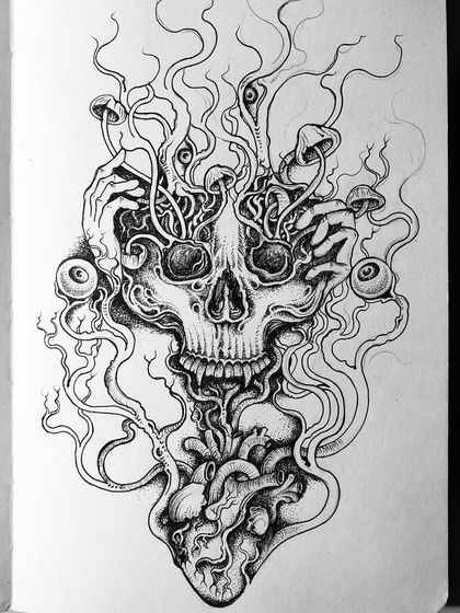 - Surreal tattoo art with eyes, skulls, mushrooms, and strange roots - sometimes it’s pure trippy, sometimes more spiritual.