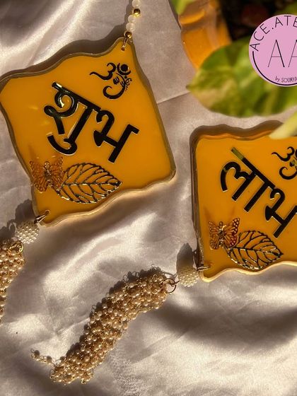 We make custom home and pooja decor like nameplates, clocks, trays, and thalis, all made-to-order with your names, dates, or even real flowers from your events.