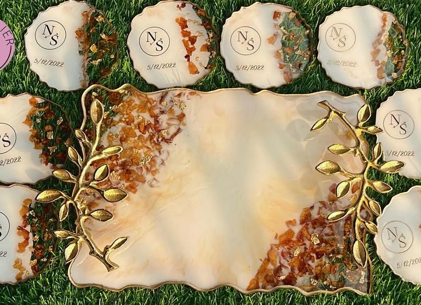 I create stylish and functional resin pieces to help you serve and organize. This includes serving trays, multi-tiered stands, and unique coaster sets like the coffee bean or checkered designs, which can also be customized with corporate logos.