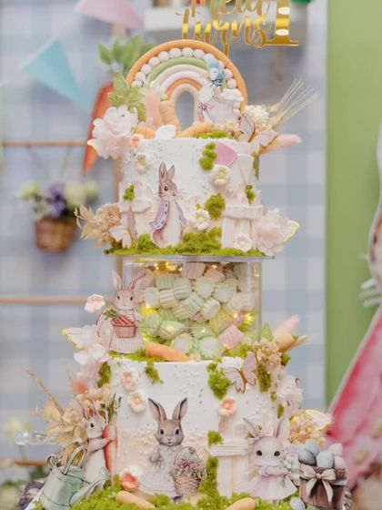 I bring beloved children's stories to life, perfect for a first birthday or a nostalgic baby shower. This gallery showcases a Peter Rabbit theme, featuring custom character cutouts, a detailed multi-tiered cake, and coordinated decor elements.