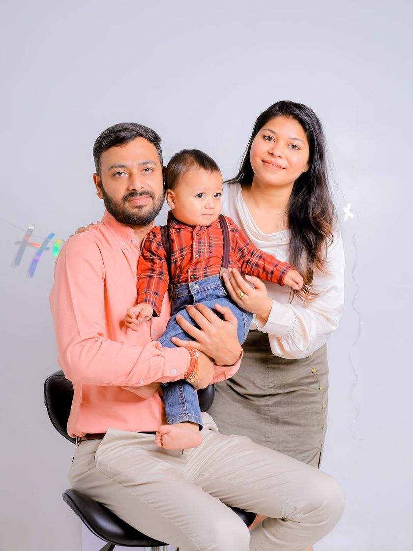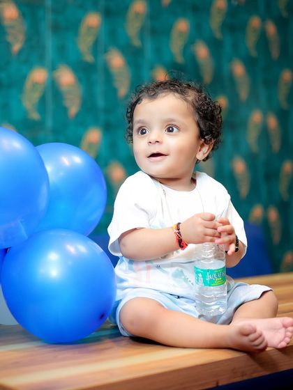 I handle first birthday and cake smash sessions in my Noida studio. The setup is clean and simple with a white background, which puts all the focus on your baby's expressions and the fun of the moment. I provide props like 'ONE' letters and can capture everything from classic family portraits to the messy, joyful cake smash itself.
