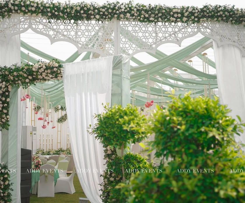 We design Nikah ceremonies that are a beautiful blend of tradition, grace, and sophisticated style. This gallery highlights our work with pastel color palettes, particularly serene greens and whites, complemented by Mughal-inspired architectural elements, delicate florals, and luxurious details like pearls and custom ring platters. Each setup is crafted to reflect the sanctity and elegance of the union.