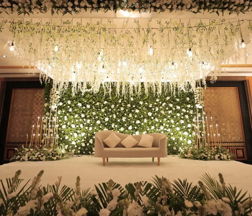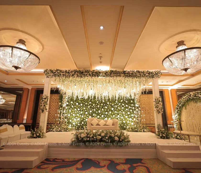 We design timeless events centered around classic elegance and glamour. This includes stunning all-white floral stages with cascading blooms, opulent chandeliers, and sophisticated details like pearl draping and shimmer walls for a truly luxurious feel.