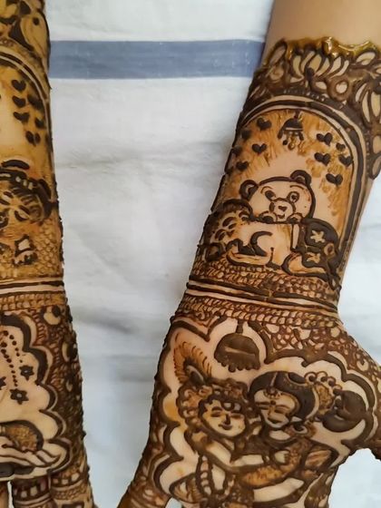 Let's make your mehndi truly yours by hiding your partner's name, initials, or special symbols within the design. I love incorporating unique motifs like wedding rings, elephants, or even baby-themed elements for a *goud bharai*.
