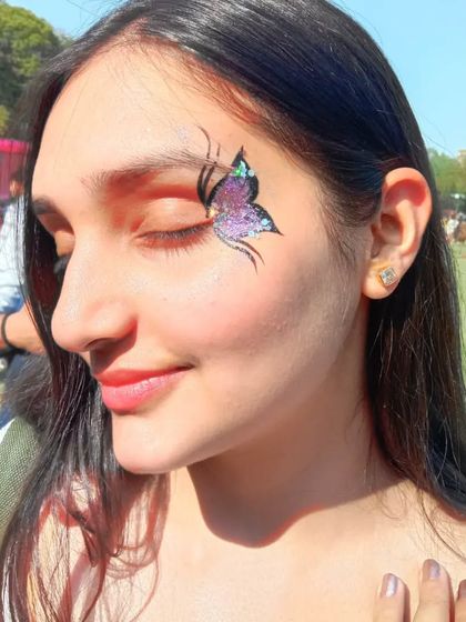 My most requested style, perfect for any occasion. I create everything from delicate, single-color butterflies to bold, multi-colored wings with lots of glitter, placed on the face, shoulder, or collarbone.