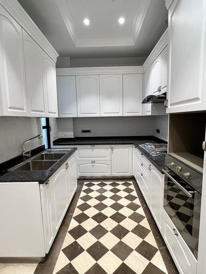 - Modular kitchen with solid wood cabinets, granite counters, and all appliances fitted