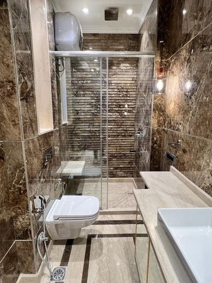 Our bathrooms are designed to be your personal spa, featuring floor-to-ceiling Italian marble and premium branded fixtures. We focus on creating a luxurious experience with features like glass shower partitions, elegant vanities, and ambient backlit mirrors.
