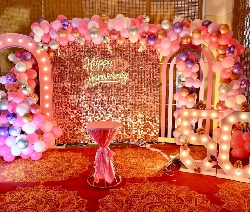 Mark your special years together with a celebration that shines. We provide decorations for all anniversaries, featuring shimmering sequin backdrops, custom balloon arrangements, and large, light-up marquee numbers to highlight your milestone.