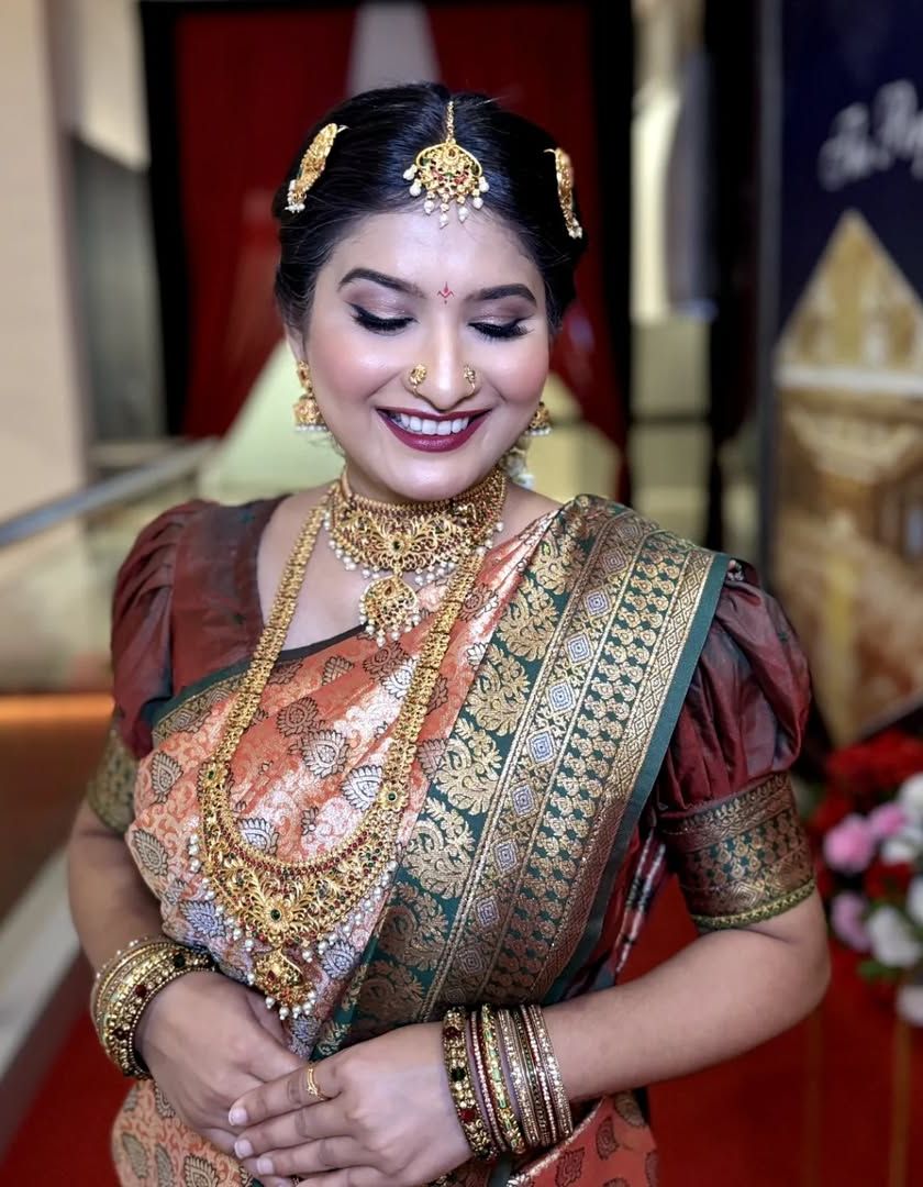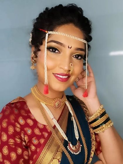 From the subtle glow for a Sakarpuda to the classic Nauvari saree look for the wedding. I specialize in creating the iconic crescent bindi and ensuring the makeup harmonizes with traditional jewelry like the nath and thushi.