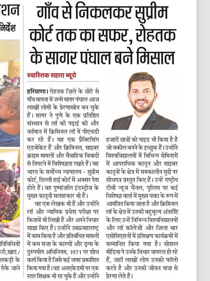 Namaskar, Sagar Panghal yahan. Rohtak se hoon, Haryana ka chhora. 2014 mein CLAT diya tha jab logon ko pata bhi nahi tha ki yeh exam hota kya hai. Ab toh YouTube pe laakhon videos mil jayengi. Symbiosis, Pune se padhai ki, ab Supreme Court tak aa gaya hoon, par apne roots nahi bhoolta. Mera maksad hai ki har aadmi ko uske adhikar pata ho. Abhi-abhi shaadi hui, biwi bhi advocate hai - shaadi se pehle bail argue ki thi, dono ne milke. Zindagi mein grounded rehna zaroori hai, chahe court ho ya kheth. Shukrana!