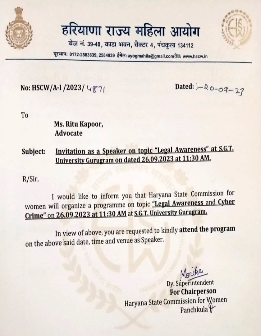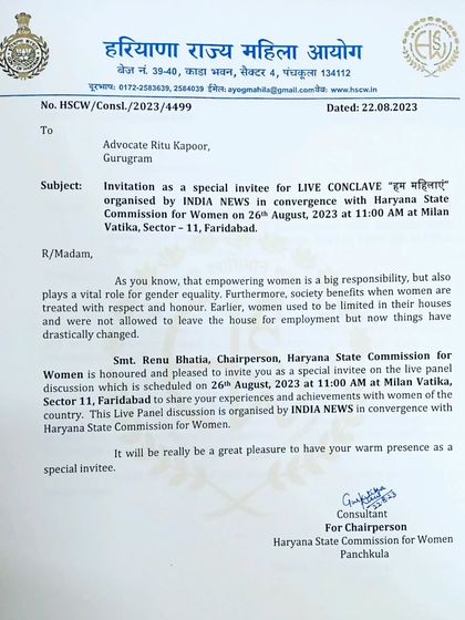 I am often invited to lend my voice and expertise as a speaker at various legal awareness programs, conclaves, and summits on women's rights and family law. This is a collection of some of the official invitations I have received.