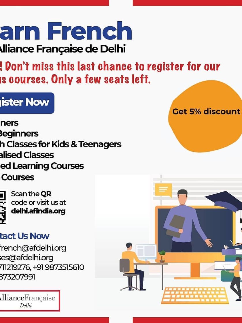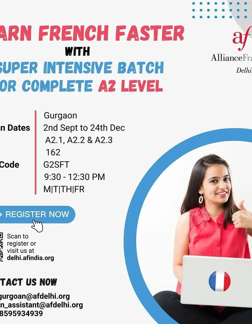 We offer a complete range of French courses for adults, from complete beginner (A1) to advanced (C1). You can choose from weekday or weekend batches to fit your schedule, all taught online or at our Gurgaon centre by certified instructors.