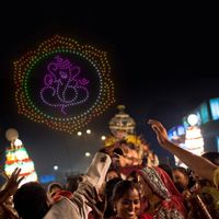 I bring cultural and festive symbols to life against the night sky, perfect for holidays, religious ceremonies, and national events. I can animate iconic figures like Ganesha and Lakshmi, national symbols like the peacock, or even display greetings and city names in Devanagari script for a truly localized experience.