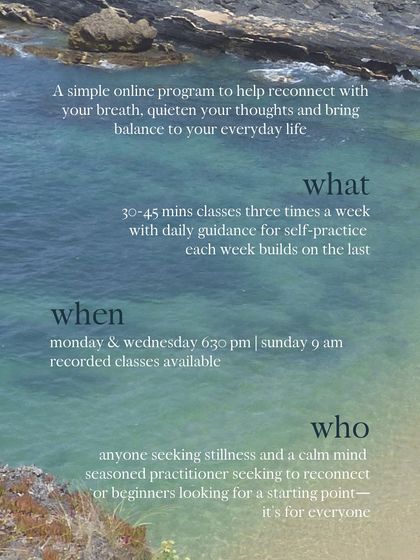 This is my foundational online program designed to help you build a sustainable self-practice of pranayama and mindfulness. Over 21 days, we meet live three times a week for simple, guided breathwork and meditation sessions, with recordings available if you miss one. The goal is to quiet the mind, reduce stress, and reconnect with yourself in a supportive, no-pressure environment.