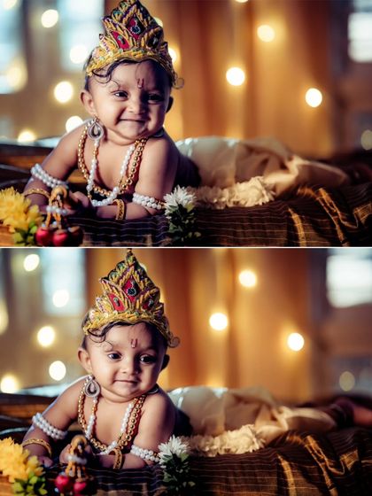 We bring your creative ideas to life with fully styled photoshoots. We handle everything from cultural themes like Little Krishna to fun concepts like superheroes, including costumes, props, and custom backdrops to create a truly unique and memorable portrait session for your baby.