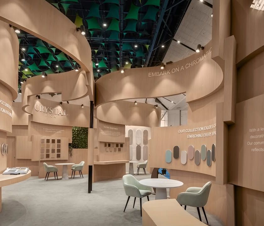 We specialize in creating exhibition spaces that feel fluid and natural, using curvilinear volumes to guide visitor flow and create an inviting atmosphere. These designs often feature sweeping lines, rounded walls, and organic shapes to produce a refined and memorable architectural experience that stands out from typical box-like stalls.