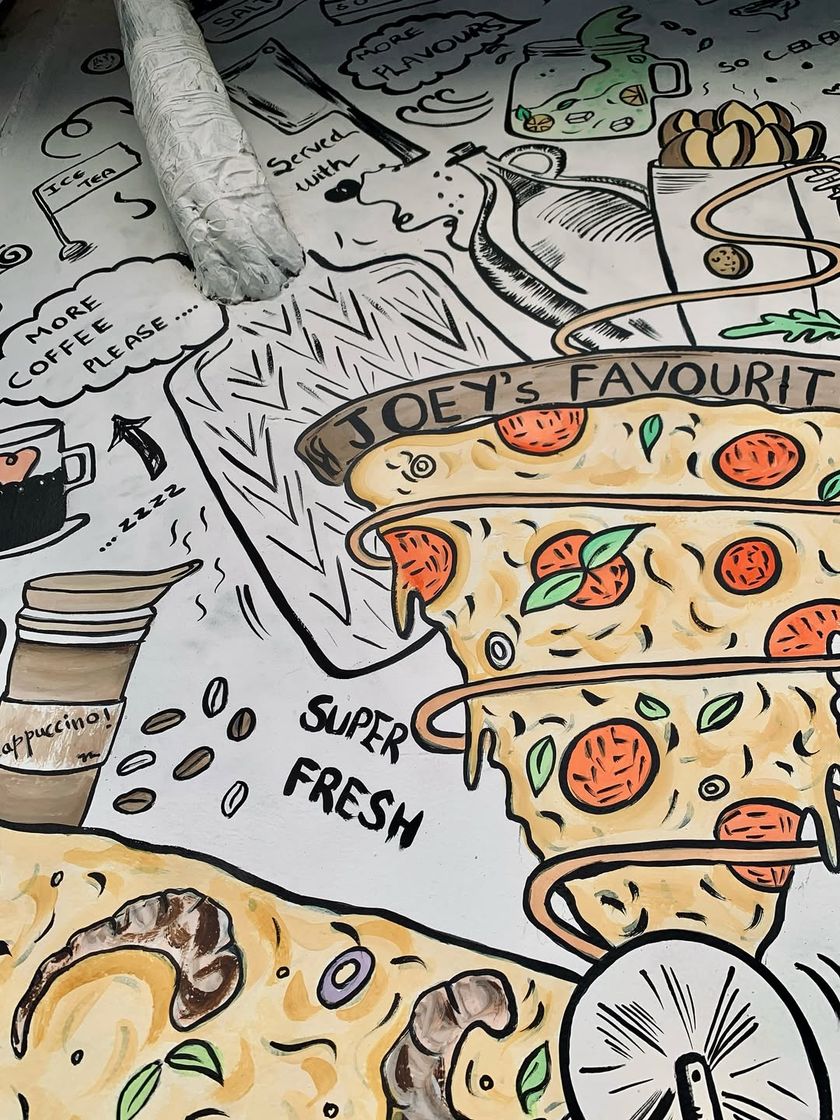 I create murals that turn your brand identity into a visual experience for your customers. I specialize in designing artwork that is not only eye-catching but also integrates with the physical space, like incorporating pipes and lights into a food-themed mural for a pizza cafe.