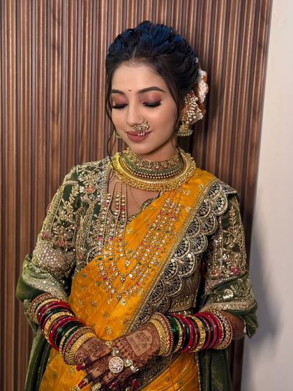 I have a special love for creating authentic traditional looks, especially for Maharashtrian brides. I focus on all the important details, from the classic 'Nauvari' saree drape and the traditional 'mundavalya' to creating a radiant makeup look with a bold lip and expressive eyes that honor our rich culture.