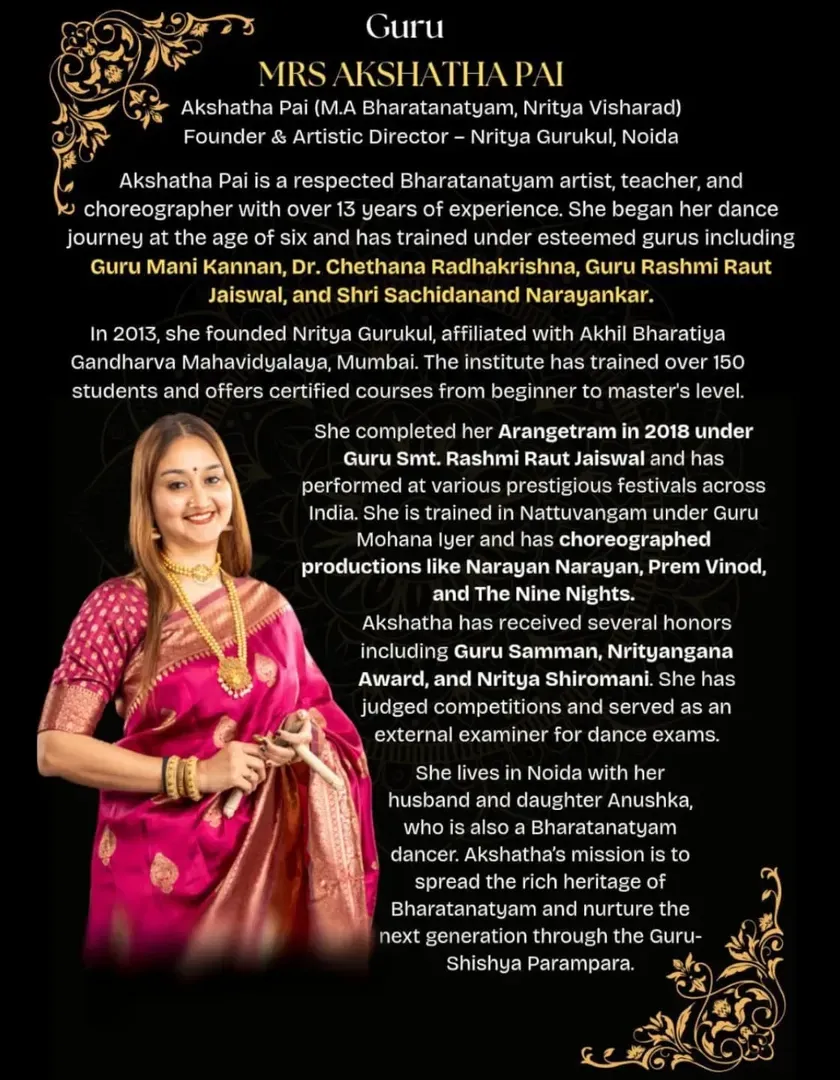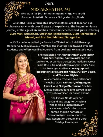 Dance has been my life's journey, and my mission is to share its beauty and discipline with the next generation. As a performer and teacher trained under esteemed Gurus, I founded Nritya Gurukul to nurture artists through the sacred Guru-Shishya Parampara.