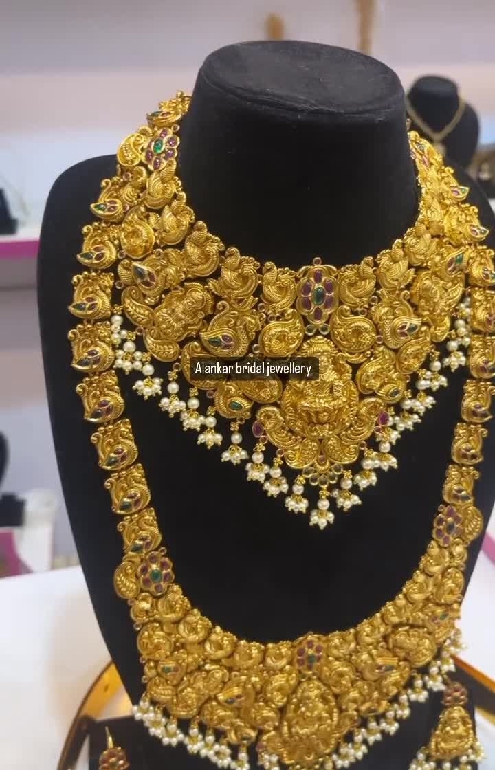 This collection is for the traditional bride who wants the authentic, grand look of heritage jewellery. We offer antique and matt gold finish sets featuring intricate carvings of deities like Lakshmi, as well as classic peacock, mango, and coin (kasu) motifs, perfect for the main wedding ceremony.