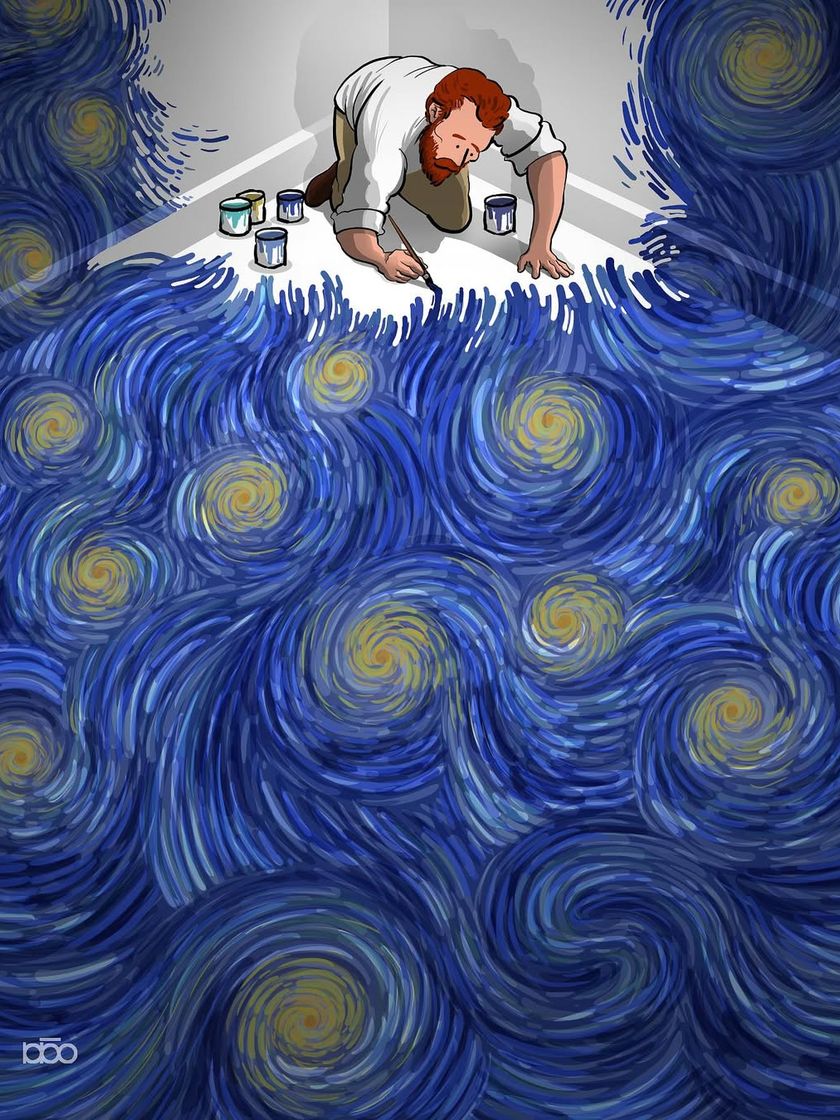The "Starry Night" is more than a painting; it's a symbol of turbulent emotion and profound beauty. In this series, I take its iconic swirling sky and weave it into new narratives and contexts, exploring themes of hope, sorrow, and the cosmos as a source of refuge and inspiration.