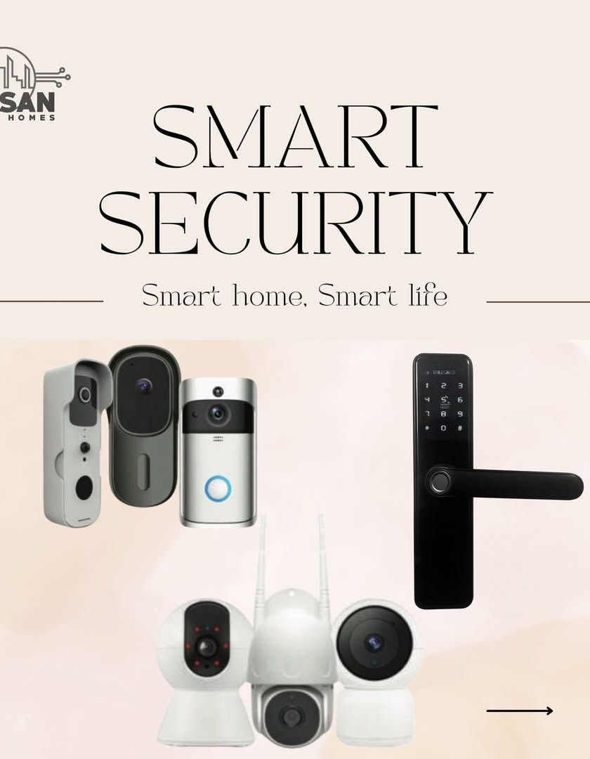 Here is a quick overview of our smart security product line. We offer a variety of smart cameras, video doorbells, and digital door locks to create a comprehensive security solution for your home or office.