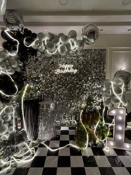 - Custom balloon arches, shimmer walls, neon signs, fairy lights, and life-sized props