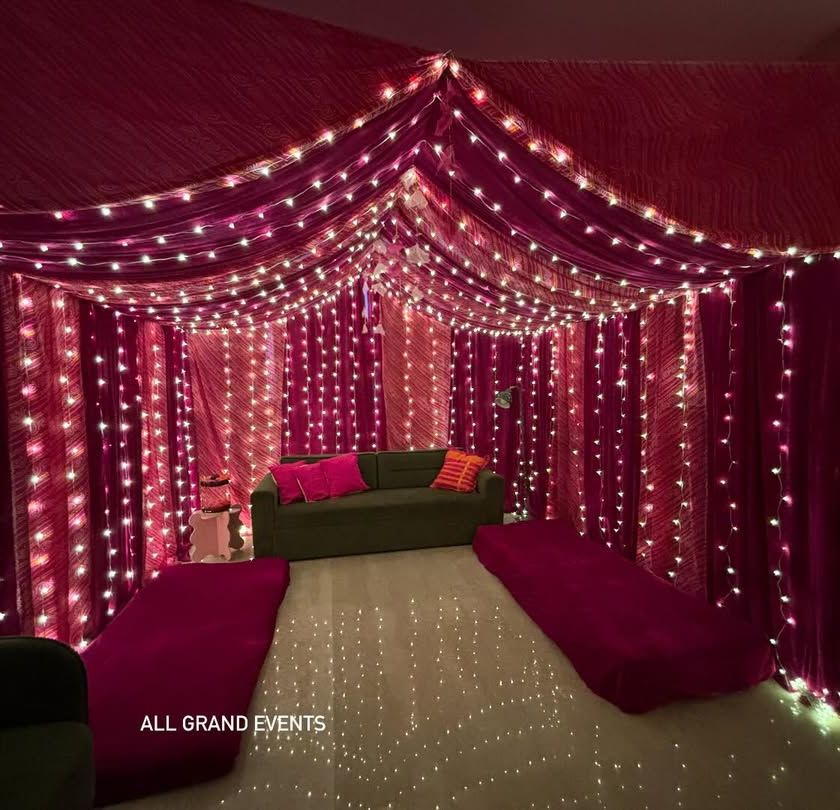 For those who love a classic Indian touch, I create vibrant decorations for festivals and traditional functions. I use elements like colorful fabric drapes, marigold flower strings, and fairy lights to transform any space into a festive celebration zone.