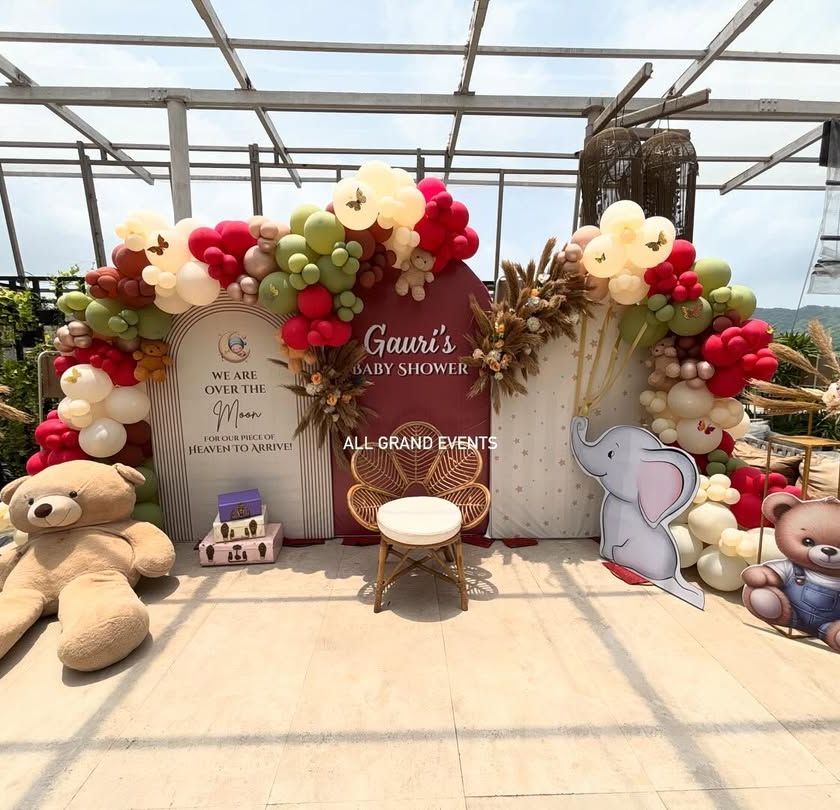 I create heartwarming decorations to celebrate new arrivals. This includes elegant baby shower backdrops with themes like "Over the Moon" and adorable props, as well as special "Welcome Baby" home entrance decor with balloons and traditional flower rangolis.