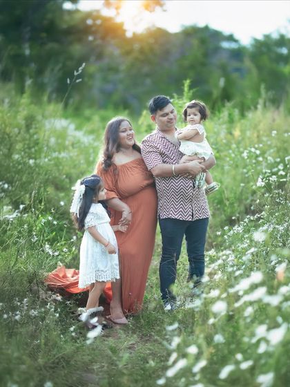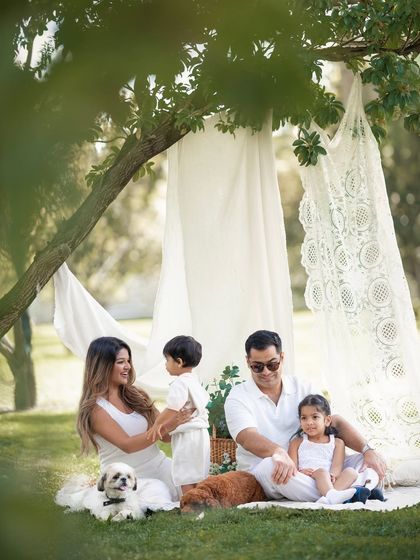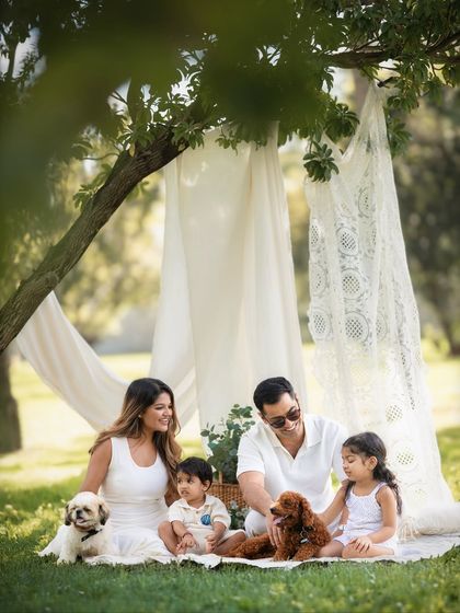 You pick the vibe. If you love nature, we can head out for Bangalore outdoor family portraits - golden hour, open fields, boho picnic photoshoot setups with blankets and flowers, or just your crew hanging out. If you’re more into a laidback indoor feel, my cozy studio session is ready for whatever mood you’re after - classic, bright, airy, or something totally clean and simple. Pets are welcome, too! I want your whole family in the frame, fur babies included.