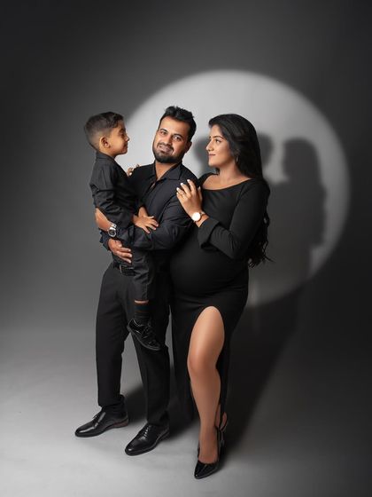 We offer family photoshoots in studio or outdoors with candid moments, pet-friendly sessions, and all details like outfits, makeup, and props handled by us.