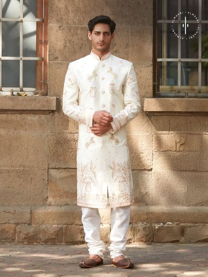 For the man of the hour. This collection is all about making the groom look and feel legendary on his wedding day. I've curated a selection of exclusive sherwanis, from timeless ivory and gold ensembles to rich, embroidered velvet pieces, ensuring you have a look that is as unforgettable as the occasion itself.