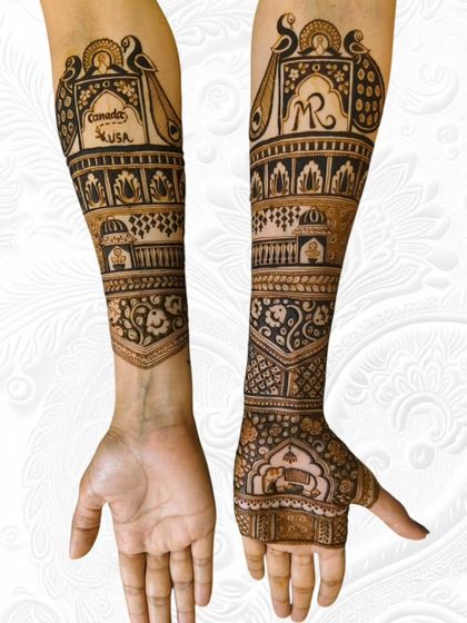 I do custom bridal mehendi for hands, arms, legs, and feet, include family designs, and add personal touches like portraits or special symbols using natural henna.
