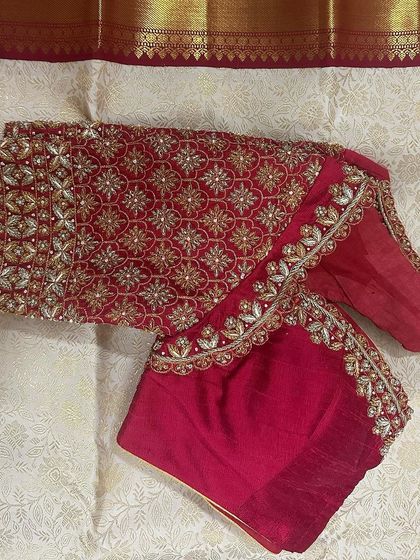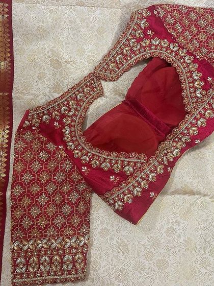 We specialize in creating custom-made saree blouses with intricate hand embroidery, particularly for South Indian bridal wear. Our designs feature detailed floral and geometric patterns using gold and silver threads on premium fabrics like velvet and silk.