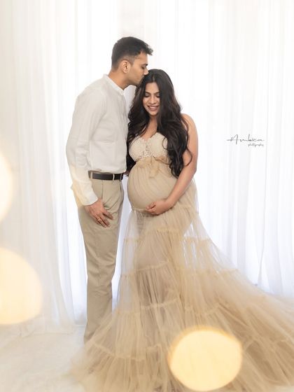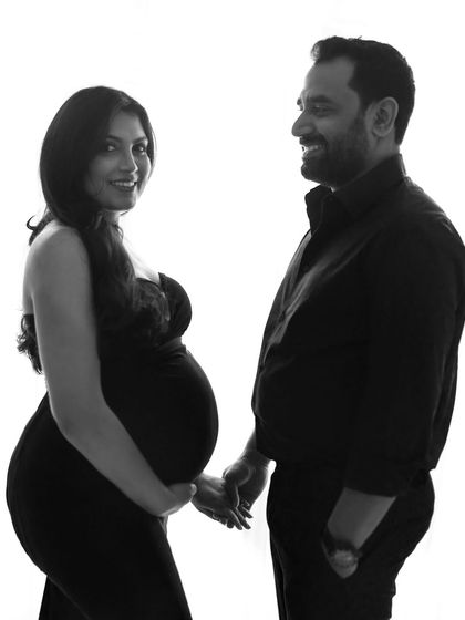 We specialize in artistic maternity photography with a distinctive painterly style. Our sessions incorporate both traditional and contemporary themes, from ethnic styling with Kancheepuram sarees to creative silhouette techniques.