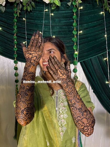 Hi, I’m Amina from Mumbra. Mehendi is my thing - all self-taught, no big team, just me and my cones. I started with doodles, now I get to make brides smile on their big day. It’s not just lines and patterns, it’s memories I get to be a part of. I pour my heart into every design, hoping you feel the love too.