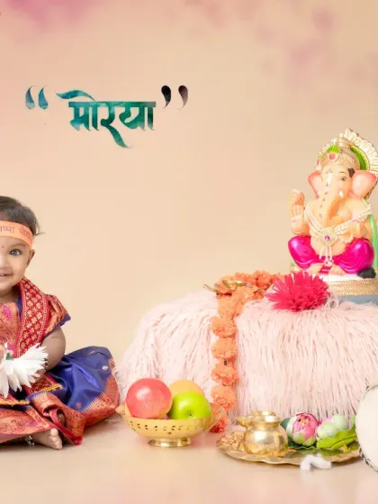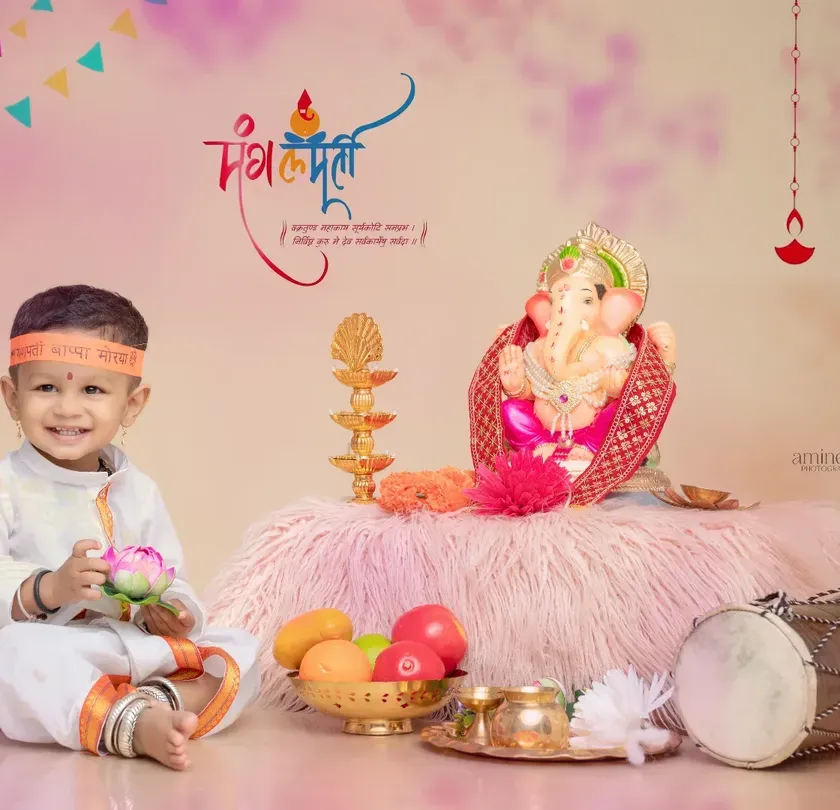 Capture the blessings of Ganpati Bappa with a themed photoshoot in my Kolhapur studio. I create a complete festive environment with a Ganpati idol, modaks, puja thalis, and traditional Maharashtrian outfits for kids and adults. These sessions are perfect for creating family memories during Ganesh Chaturthi.