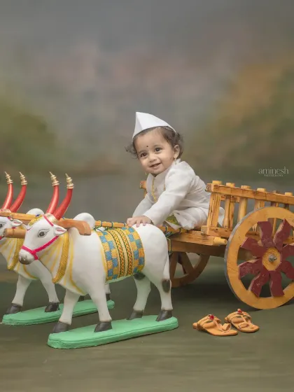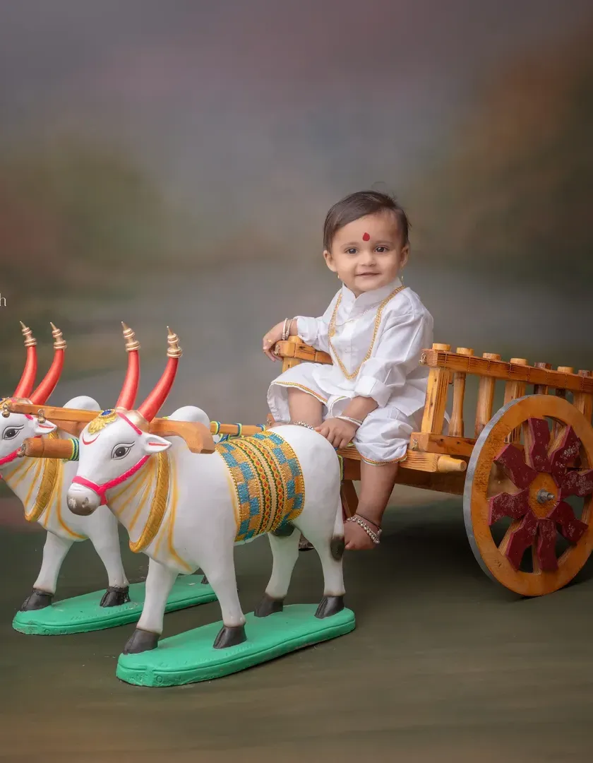 This theme is inspired by the rustic beauty of village life in Maharashtra, perfect for celebrating festivals like Bail Pola or for a unique cultural photoshoot. I use a beautifully crafted miniature bullock cart (bailgadi) as the central prop. I provide simple traditional outfits like a white kurta or a colorful festive dress.