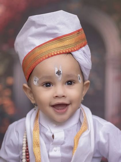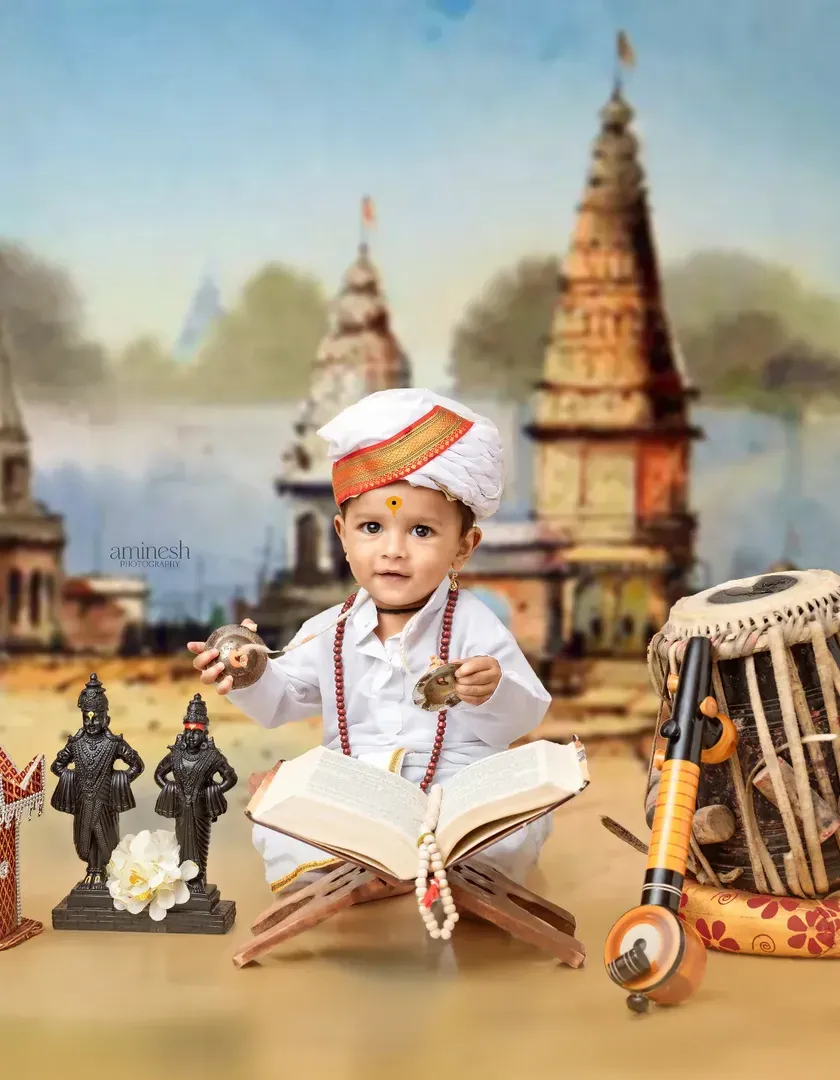 I offer a unique Varkari theme to honor the deep-rooted culture of Maharashtra and the pilgrimage to Pandharpur. Your child will be dressed in authentic Varkari attire, complete with a turban and tulsi mala. The studio setup includes Vithoba-Rukmini idols and musical props like the dholak and veena.